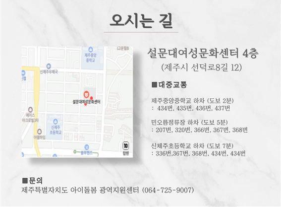 ■장소: 설문대여성문화센터 4층 대강당(제주시 선덕로8길 12)